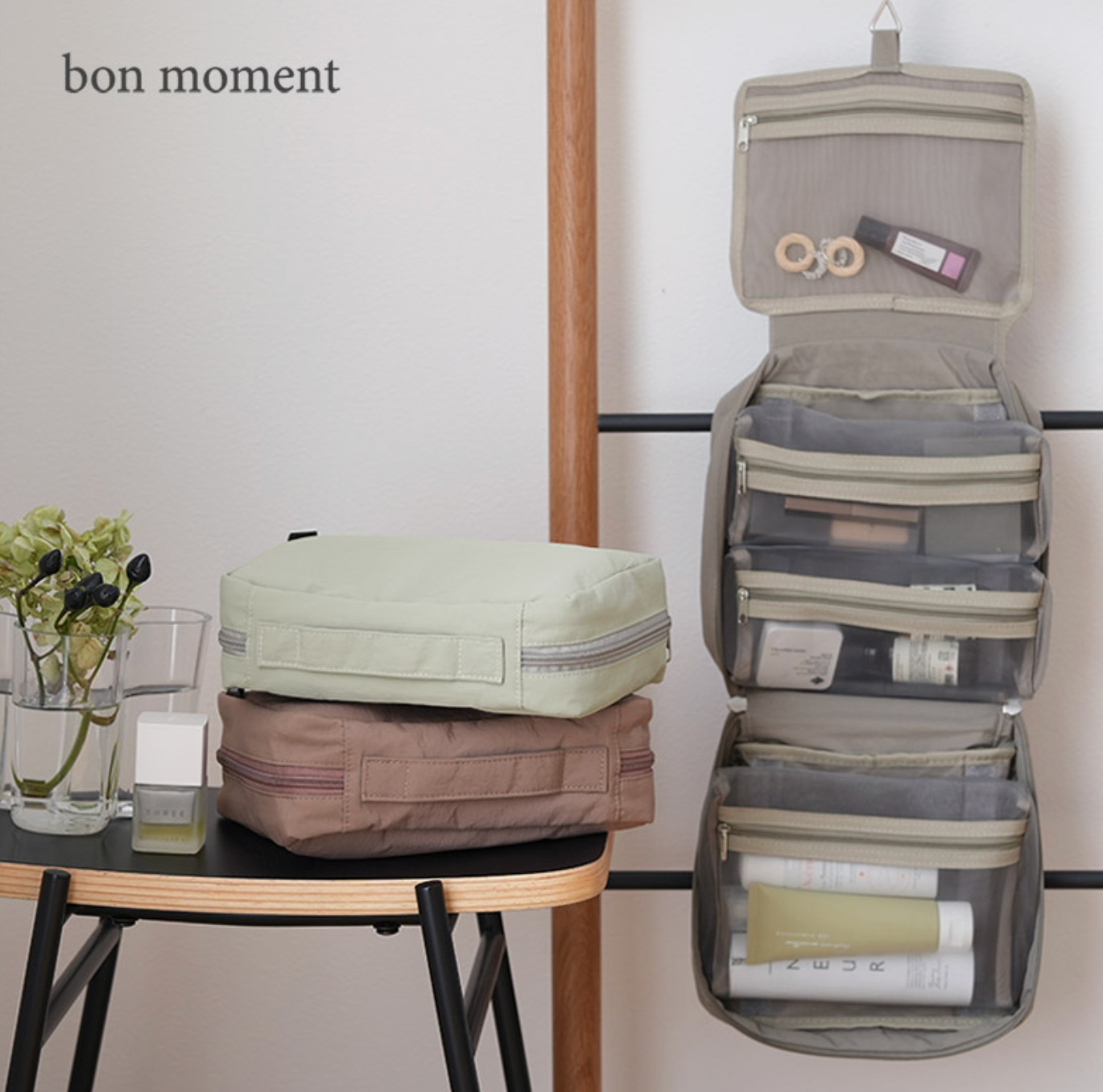 旅先で使う洗面グッズの「仕分ける」と「ひとつにまとめる」を同時に叶えるボンモマン 取り外せる吊り下げポーチ。新色のグレイッシュピンクとペールグリーンは、ママ用・子供用など使い分けもしやすいカラーです。