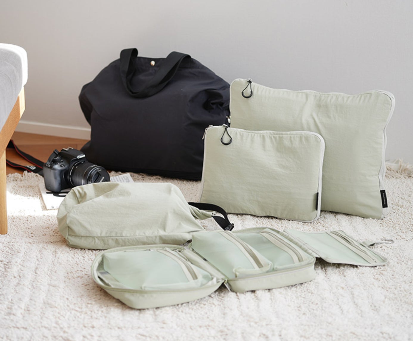 新カラーのペールグリーンは、人気の「圧縮できるトラベルポーチ」でも発売。