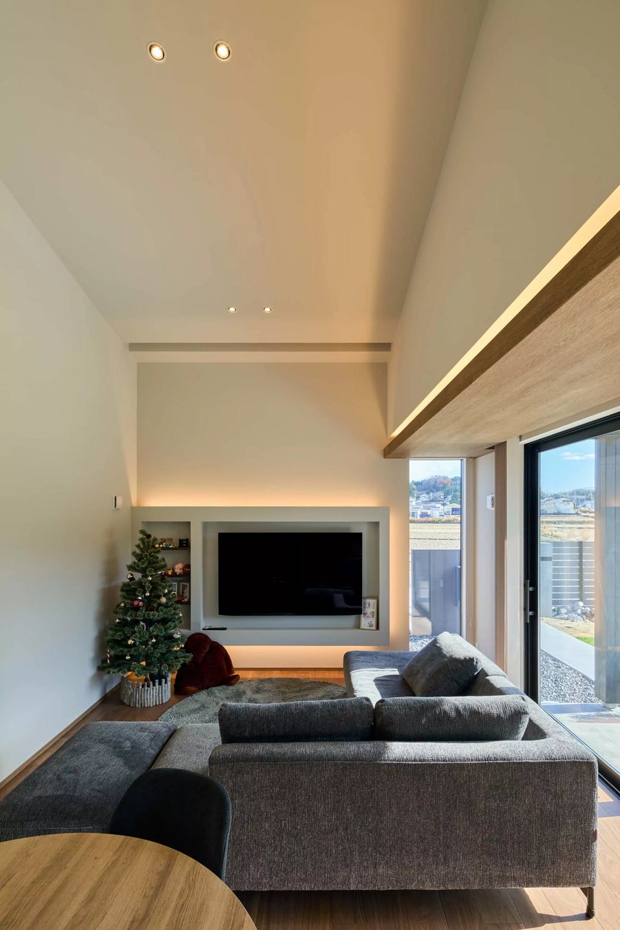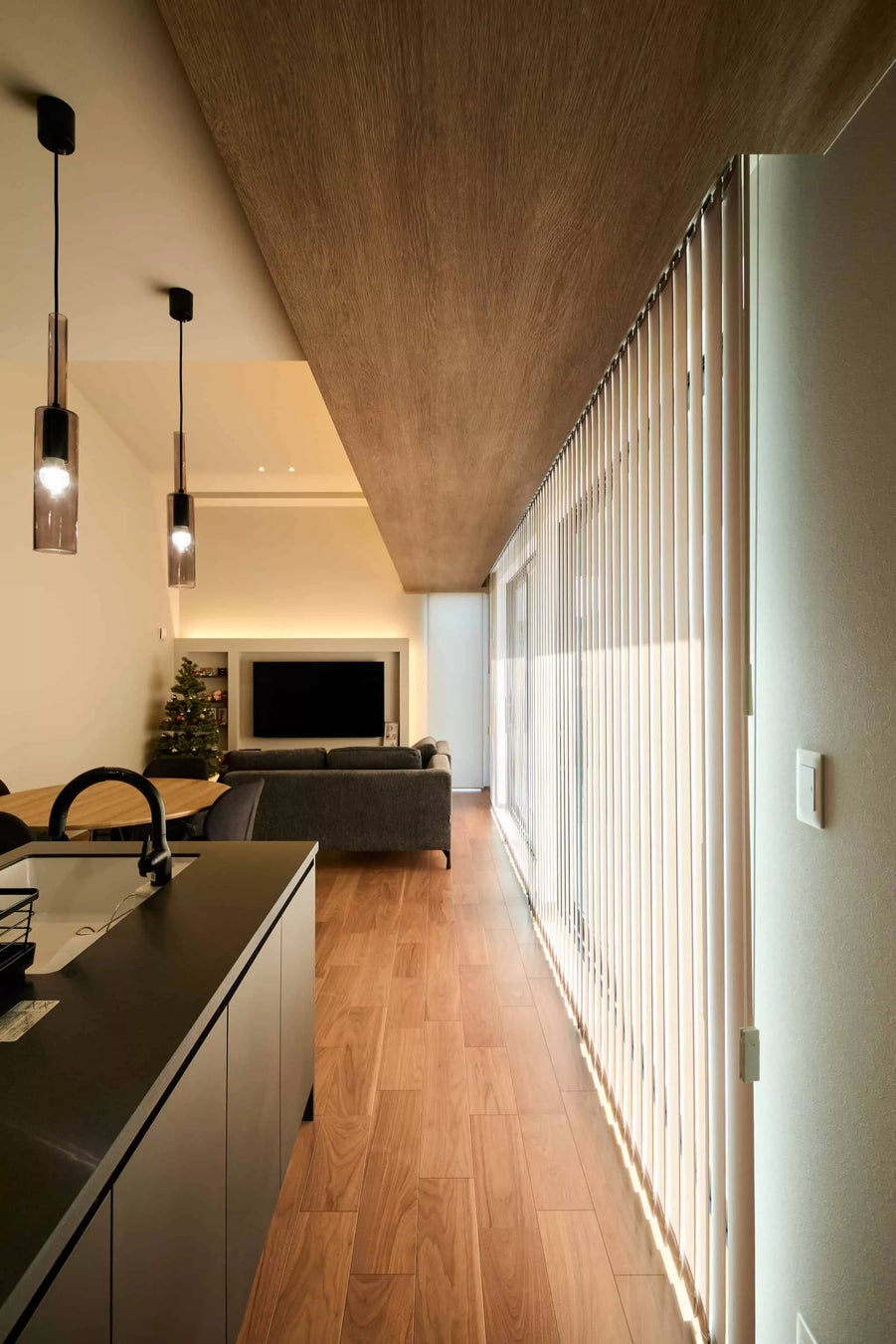 リビングダイニングは勾配天井にすることで緩やかにゾーニング。テレビ背面や下がり天井部には間接照明を仕込むことで華やかさを演出しました。