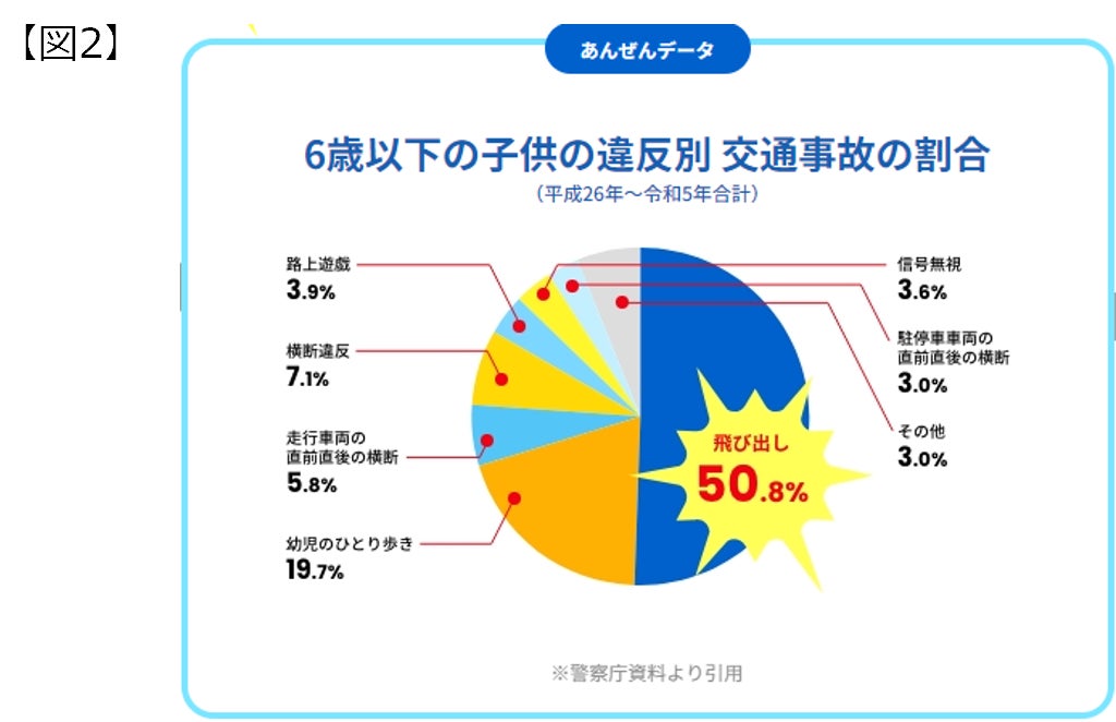 小学校に入学する年齢である7歳は、登下校や放課後の遊びなど、親の手を離れてひとり歩きする機会が増えてきます。そのため、歩行中の交通事故死傷者数が最多の年齢となっています(図1)。中でも、6歳以下の子供の交通事故の原因で最も多いのは「飛び出し事故」であり、全体の約51%が該当します(図2)。トヨタは、7歳を迎える前に交通安全を学んでいただきたいという思いから、全国の幼稚園・保育園の年長児を中心に、交通安全絵本を贈呈する活動や交通安全教室を開催するなど、交通ルールの啓発に努めています。