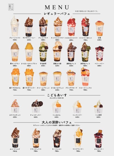 店舗では、マンゴーが山のようにトッピングされた「盛りすぎマンゴー」(750円)、表面をキャラメリゼした濃厚カスタードクリームをたっぷり入れた「クレームブリュレ」(630円)、もち米の最中、粒あん、白玉をのせ、抹茶ソースをかけた「宇治抹茶」(650円)などカップパフェ約20種類のほか、小腹が空いた時やお子さま用のミニサイズ「こどもあいす」(5種、420円~)や締めパフェとしておすすめのリキュールソースをかけた「大人の深酔いパフェ」(5種、780円)などさまざまなシチュエーションで夜パフェをお楽しみいただけます。
