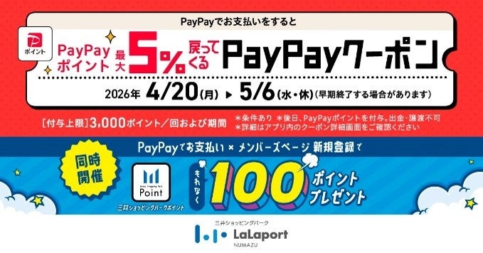 PayPayでのお支払い×メンバーズページ新規登録で三井ショッピングパークポイントもれなく100ポイントプレゼントキャンペーンも同時開催。