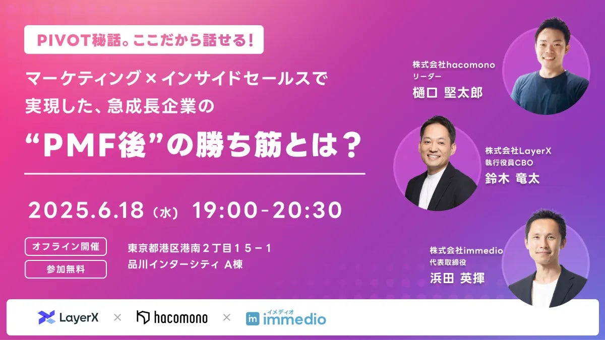 今回のイベントでは、PIVOTの放映では語りきれなかったマーケティング×インサイドセールスで実現した、急成長企業の“PMF後”の勝ち筋について、PIVOTでは話せなかった裏側も含めて、実際に登場した3名が本音で語り尽くします。