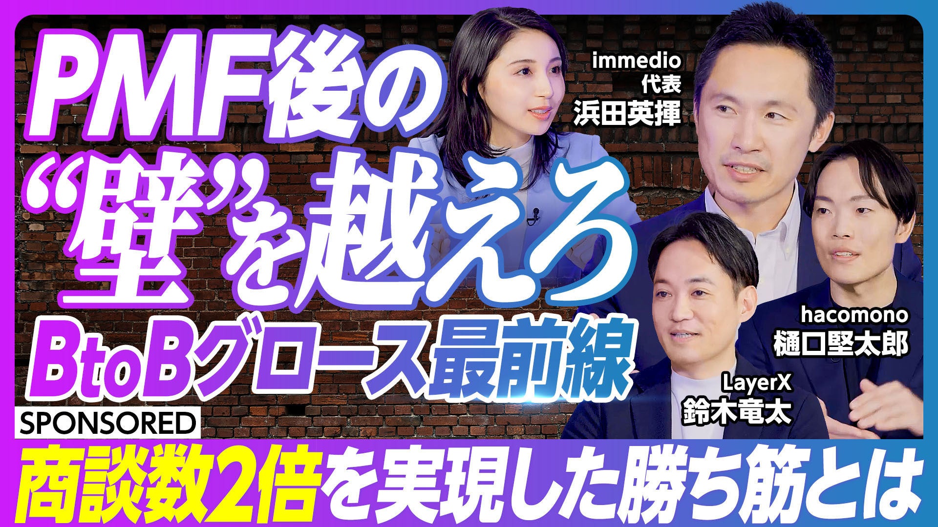 動画内容:初回のPMF後に必ず直面するのが「グロースの壁」です。急成長企業はグロースの壁を戦略と現場のオペレーションで乗り越え、高い成長率を維持しています。本動画では、急成長企業であるLayer X様の執行役員CBO 鈴木様、hacomono様のインサイドセールス責任者 樋口様をお招きし、各社のグロース戦略とオペレーションについて徹底議論をします。