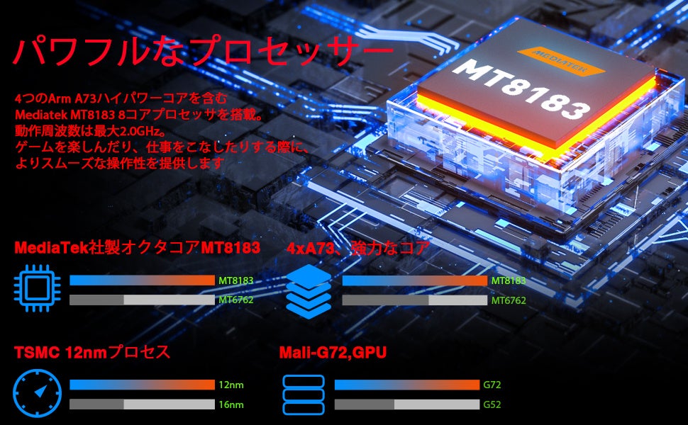 [MTK 8183 8コアCPU+6GB+128GB】MediaTek 8183は8コアCPU MT8183とMali -G72グラフィックプロセッサ+最大周波数2.0GHzのA73アーキテクチャの高性能コアを4個搭載した低消費電力の12nmプロセスで構築されており、Antutuランスコアは最大23万点、6GB LPDDR4X大容量メモリでより快適に楽しむことができる。 PUBGやSpeed Racerなどの大型ゲームも超高速でスムーズに動きます。 さらに、128GBの高速ストレージ容量により、より多くのアプリ、動画、写真などの保存に対応し、お気に入りの本、曲、写真、映画、ゲームなどをすべてダウンロードして保存することが可能です。 容量が足りなくなる心配はありません。