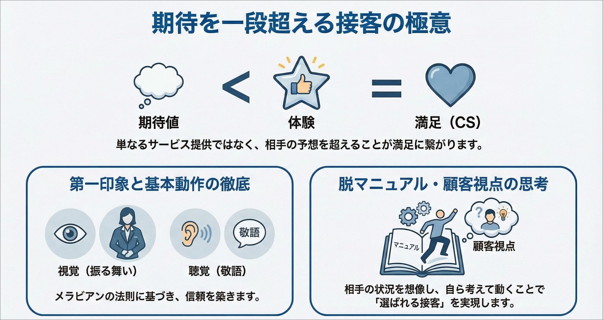 本研修は、接客の基本動作と顧客視点の考え方を実装し、相手の期待を超える高い満足度を提供できるようになることが狙いです。