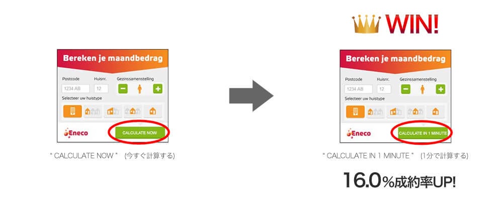 「今すぐ計算する」と「1分で計算する」をテストした結果、「1分で計算する」の方が16%もコンバージョン率が高かったのです。