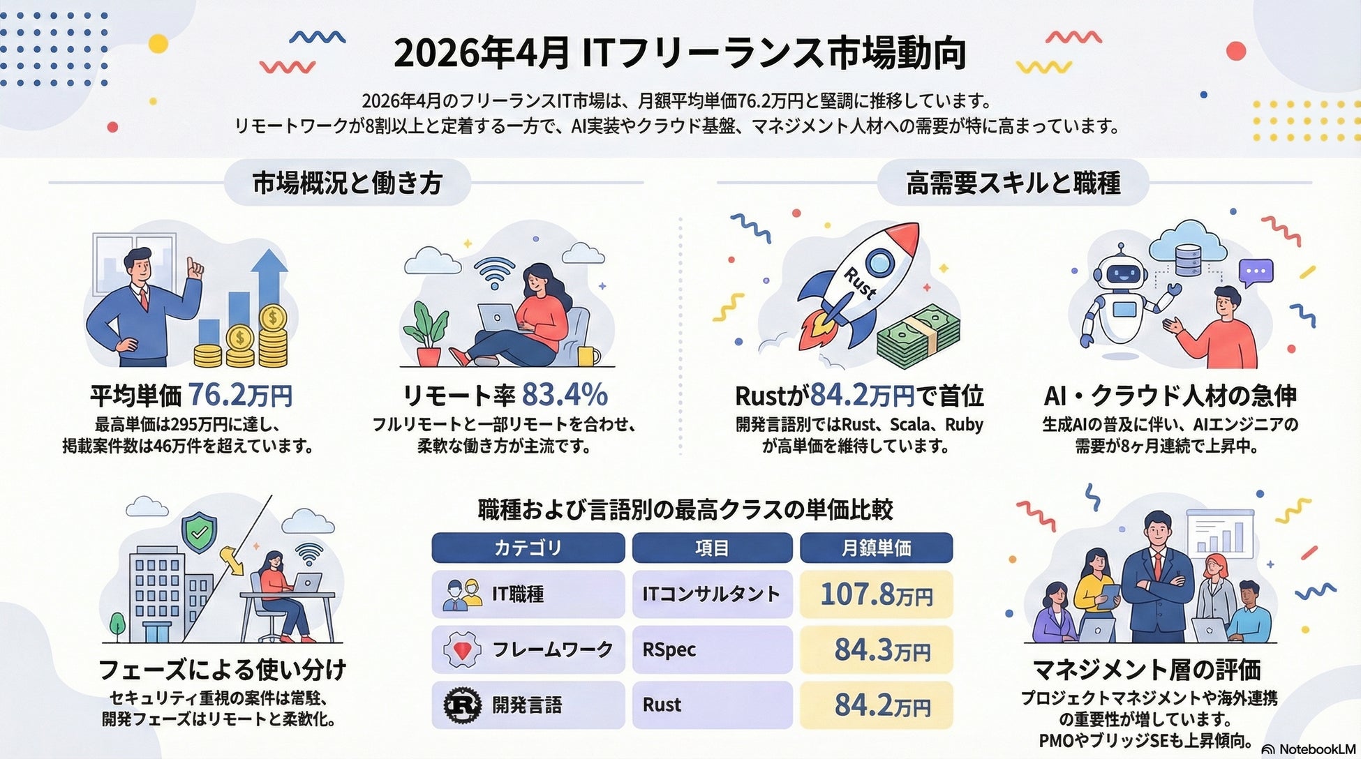 2026年4月のフリーランス案件の月額平均単価は76.2万円、最高単価は295万円です。