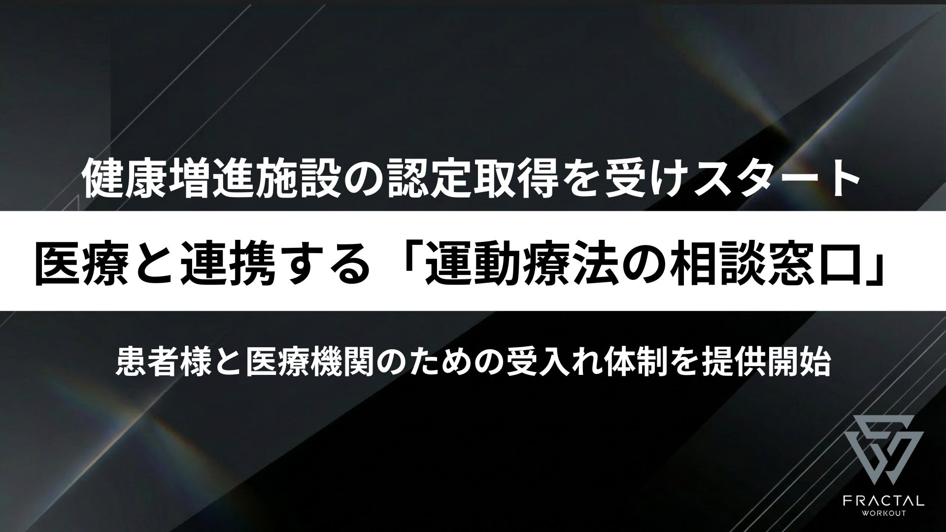 フラクタルワークアウト株式会社は、原宿駅前で運営する完全個室のパーソナルトレーニングジムが健康増進施設の認定を取得したことを受け、指定運動療法施設の申請準備を進めるとともに、運動療法にご関心のある患者様および医療機関(クリニック等)に向けた「医療連携・運動療法相談窓口」の提供を開始します。