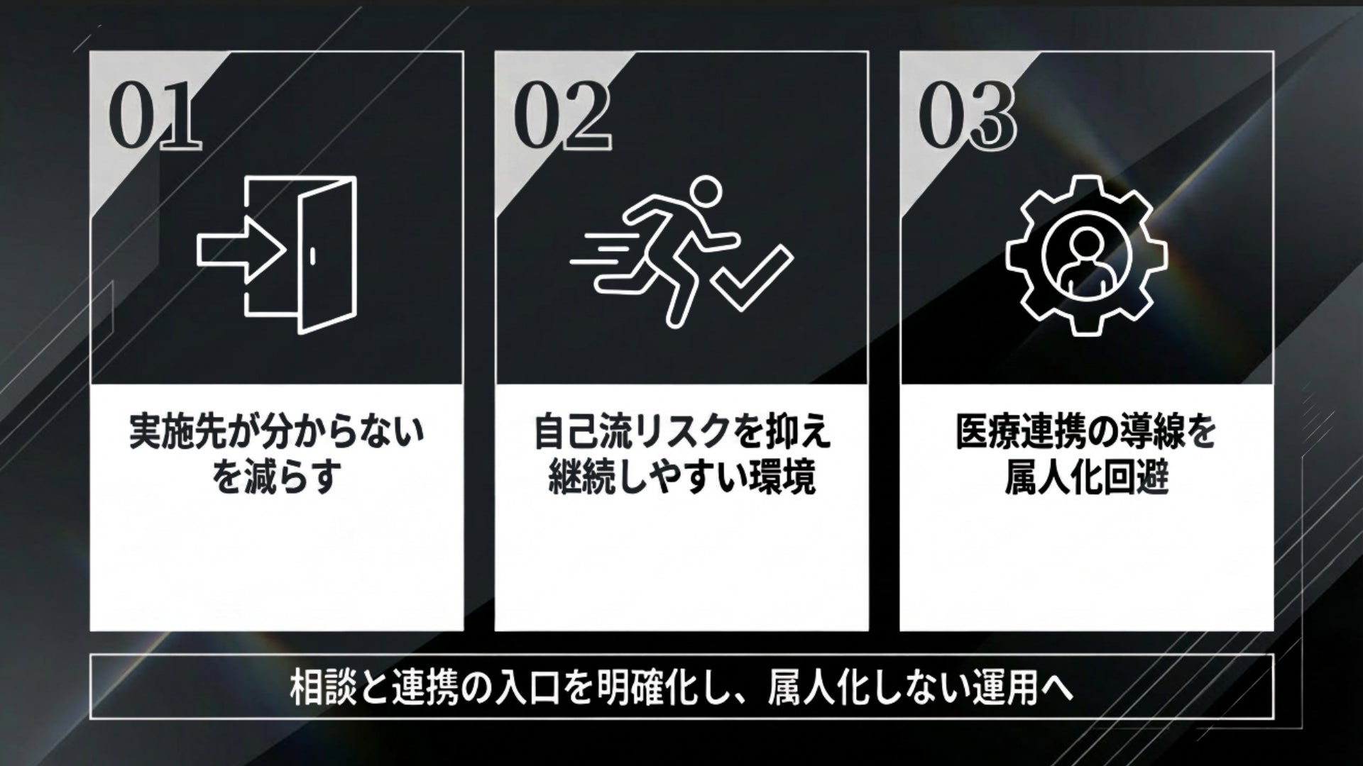 運動療法が必要な方に適切な形で届くよう、面談導線と受入れ体制を整備します。
