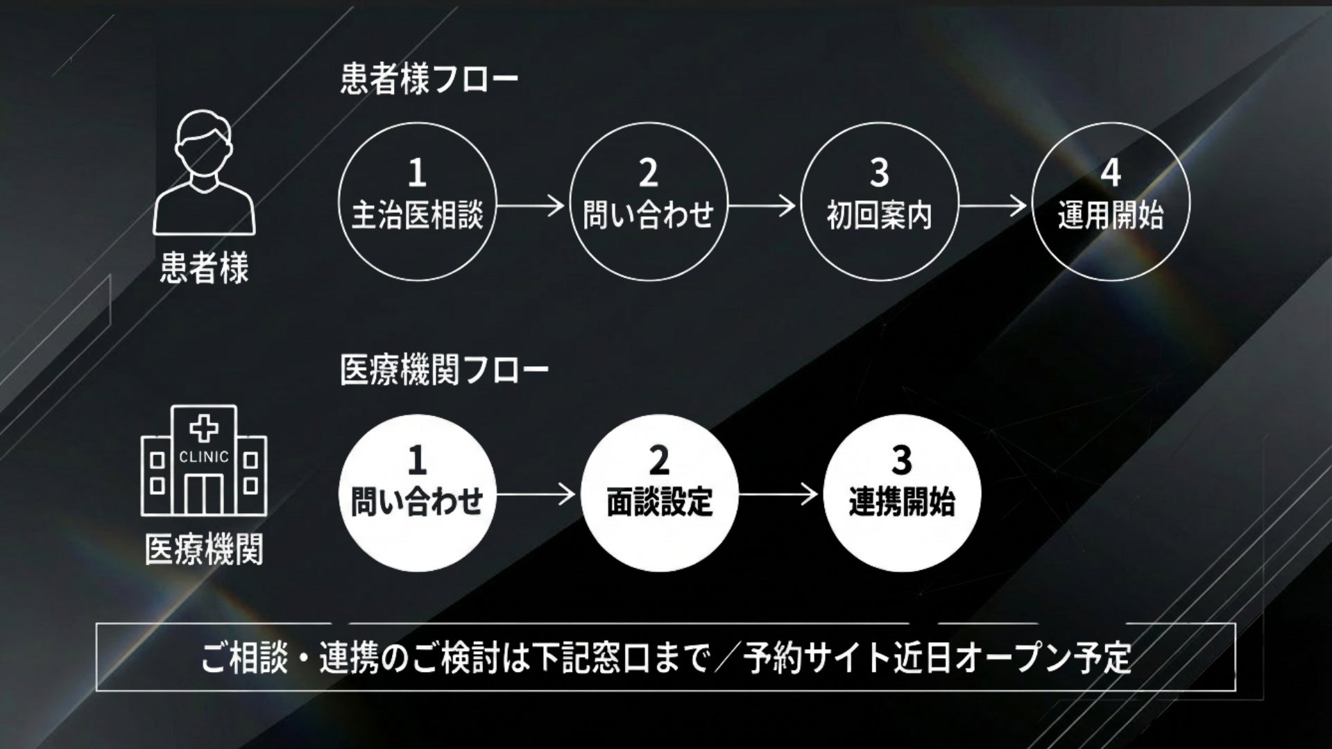医療機関からご連絡をいただく場合は、一度面談の機会を設定し、連携の考え方、対応範囲、情報連携の粒度、運用フローを整理します