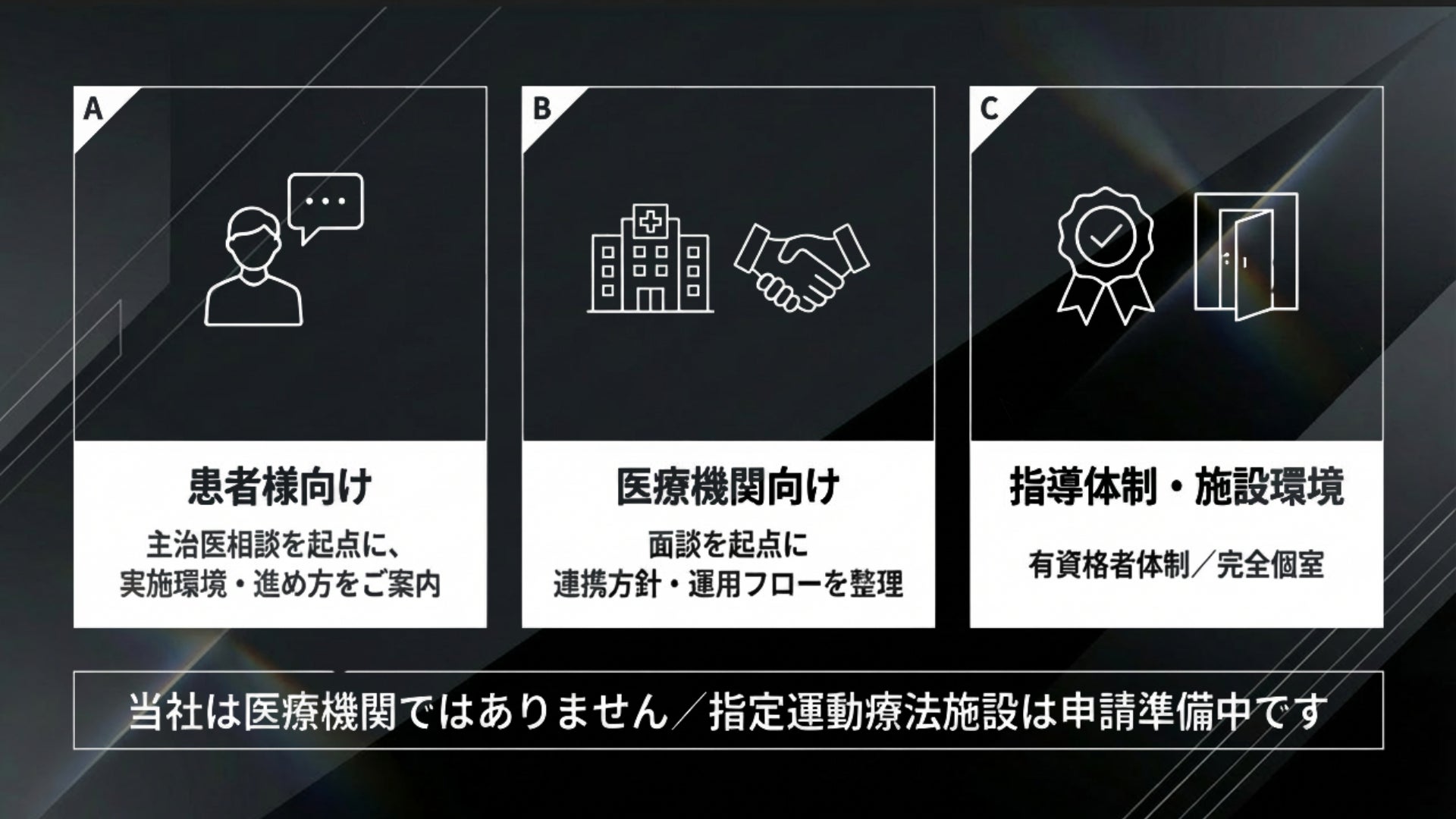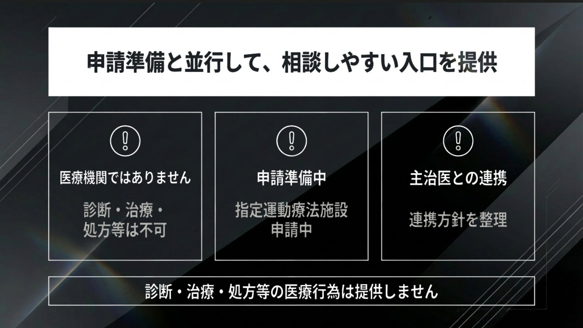 本窓口は、指定運動療法施設の申請準備と並行して、運動療法に関心のある方が相談しやすい入口を用意するものです。現時点で申請中・準備中の位置づけであり、認定の取得や制度上の取扱いを保証するものではありません。