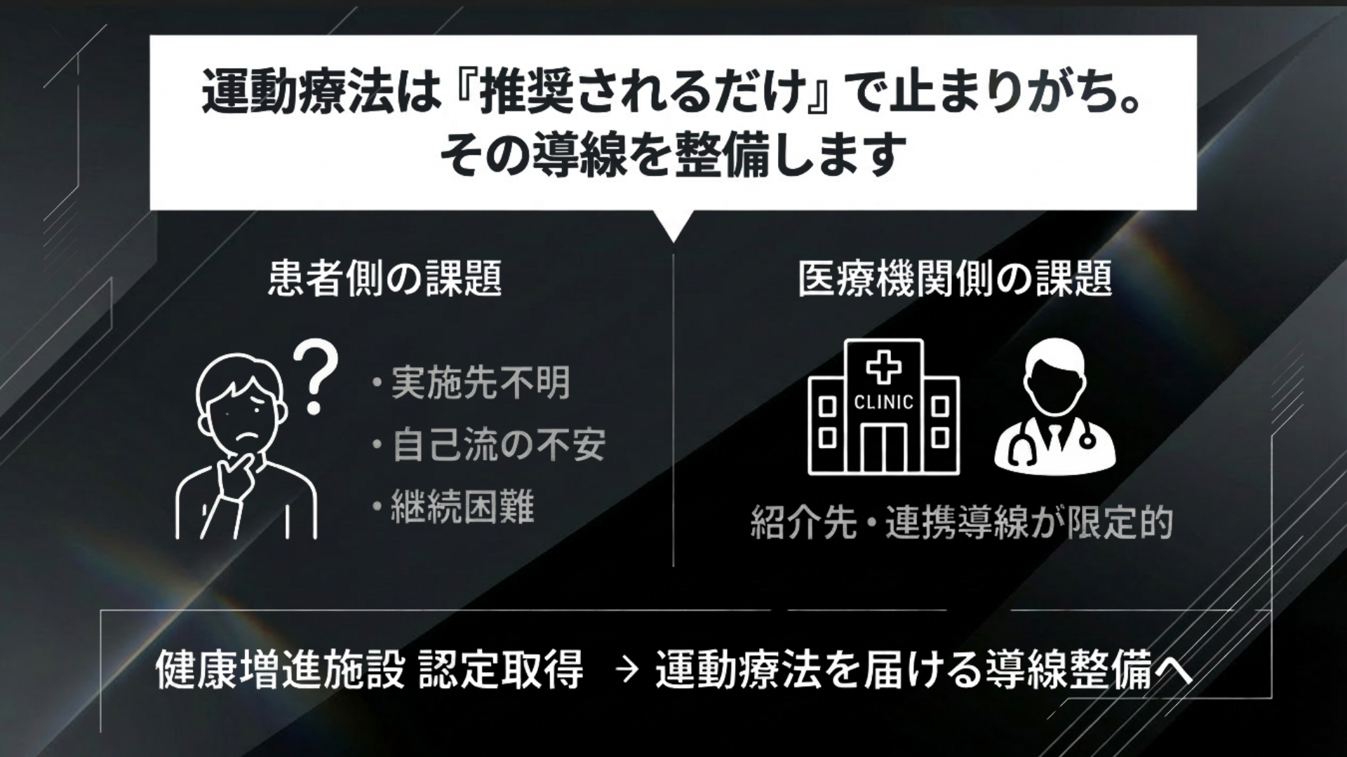 医療機関側でも、運動療法の必要性は説明できても、地域における実施先の選択肢が限られ、紹介や連携の導線を作りにくいケースが見受けられます。
