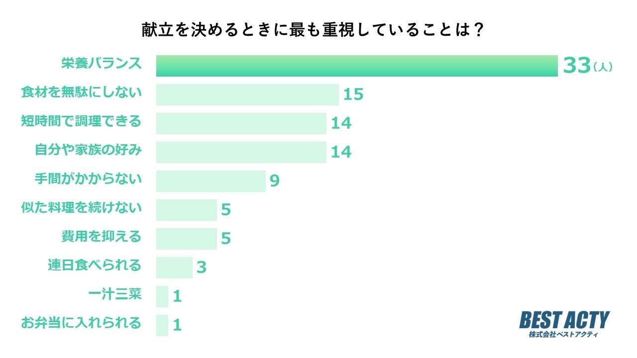 献立を決めるときに重視していることについて100人にアンケートを行ったところ、「栄養バランス」と回答する人が最も多い結果となりました。