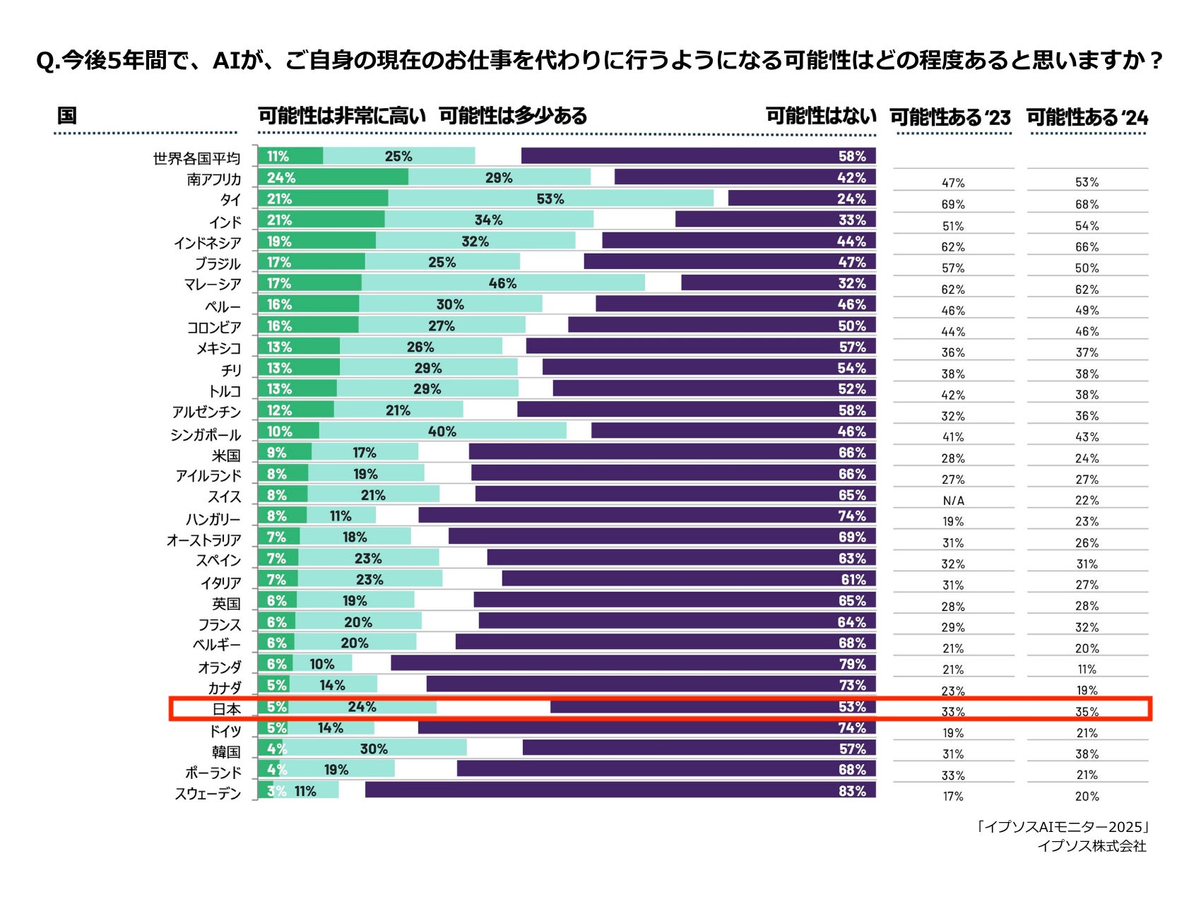 「今後5年間で、AIが、ご自身の現在のお仕事を代わりに行うようになる可能性はどの程度あると思いますか?」という質問に対して、「可能性がある」と答えた日本人は29%(可能性は非常に高い5%、可能性は多少ある24%)と、仕事におけるAI活用を考えている人は、2024年の35%から6ポイント下回る結果となりました。
