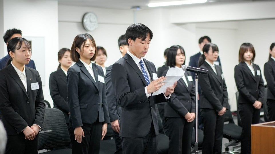 式典では、代表取締役社長・福田慎太郎による祝辞に続き、新入社員代表から社会人としての決意が述べられ、新入社員一人ひとりが社会人としての第一歩を踏み出しました。