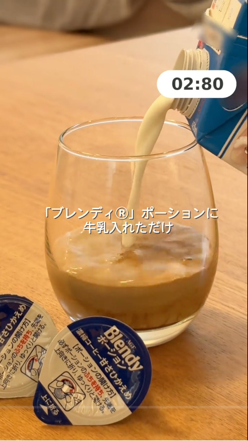 学生チームから提案されたSNSコンテンツ案の中で最も優秀と評価されたアイデアは、味の素AGFの公式TikTokで動画化され、2025年8月には再生回数100万回を突破する成果を生みました。その成功の背景には、Z世代が自らの生活シーンに寄り添う形で《ブレンディ®ポーション》の「手軽さ」「アレンジのしやすさ」をさりげなく訴求した点、そして「朝ポ」というキャッチーなフレーズを取り入れた点があり、学生ならではの発想と共感力が大きな鍵となりました。