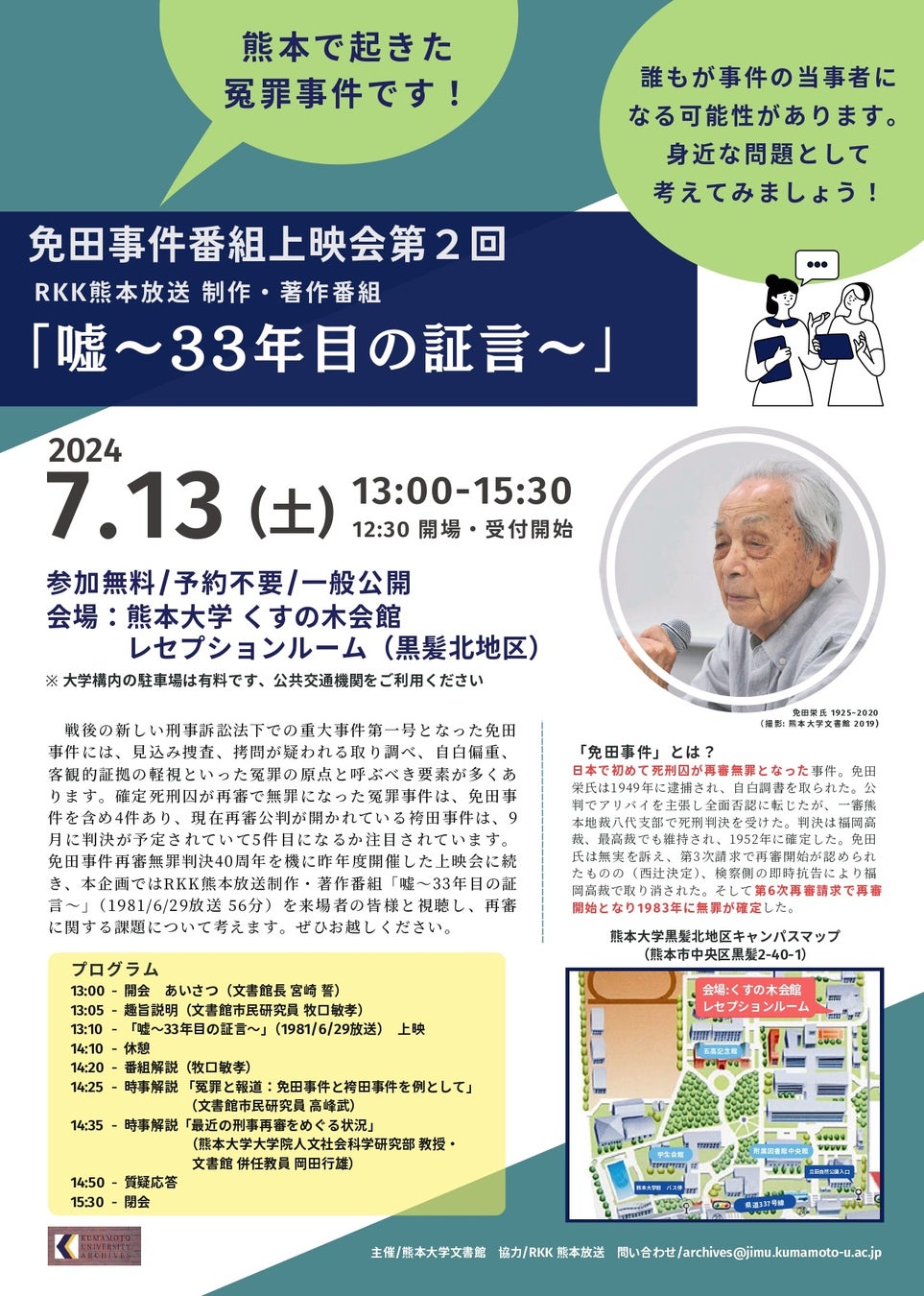 熊本大学文書館では、本学の歴史に関する資料に加え、社会的にも関心が高い免田事件に関する資料の収集・保存・公開を行っています。免田事件再審無罪判決40周年を機に昨年度開催した第1回上映会に続き、本館主催にて、RKK熊本放送制作・著作番組「嘘~33年目の証言~」(1981/6/29放送、56分)の上映会を開催いたします。