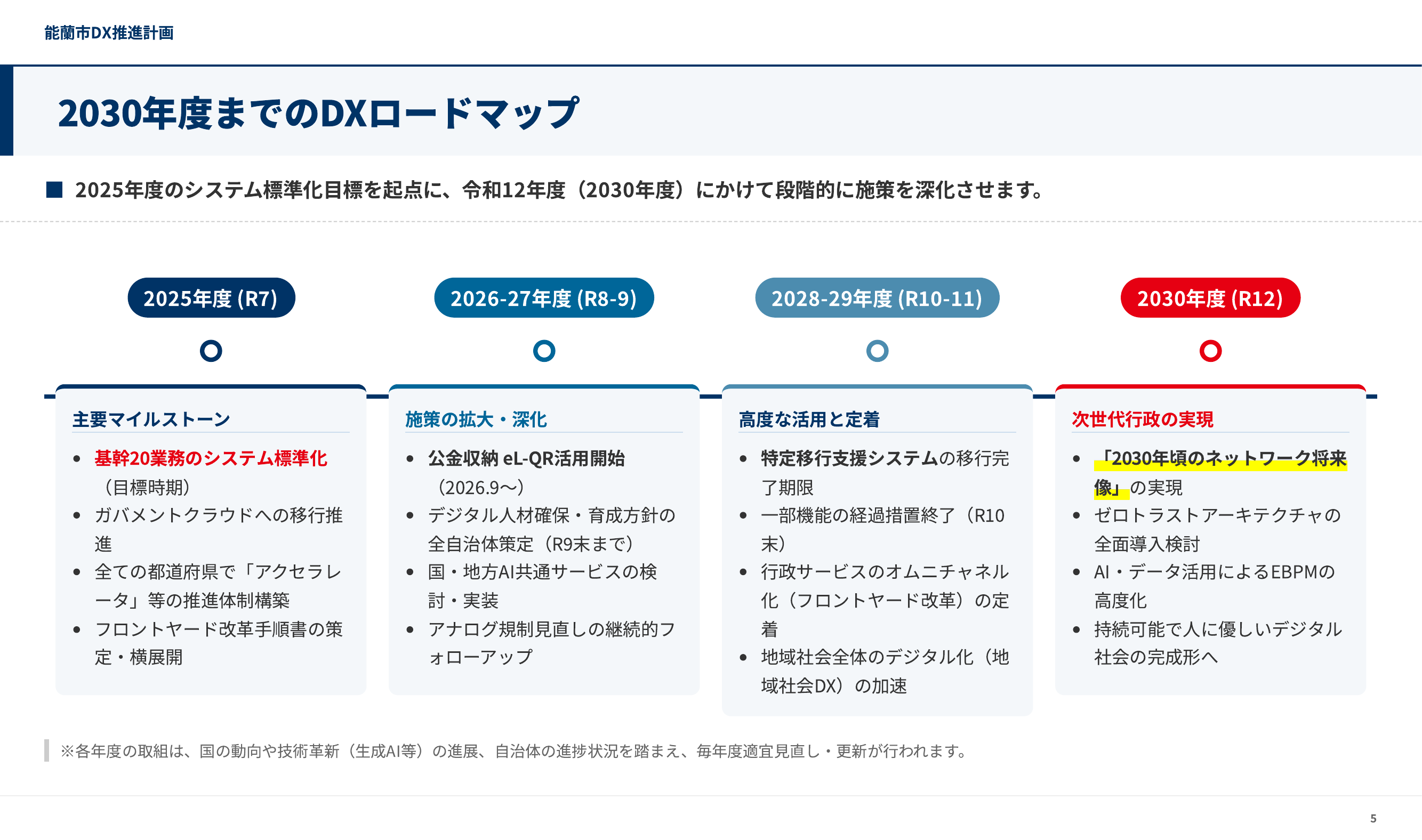 5つ目は「総合計画の住民向け概要版(全区展開向け)」です。数百ページにおよぶ総合計画を10ページ程度に要約したスライドを生成し、動画化することができます。1つのベース概要版動画を全区・全出先機関に統一的に展開できる設計となっており、計画策定・改定時に、住民や議会に向けてわかりやすい概要版動画を迅速に届けることが可能です。計画書PDFをそのまま素材として投入できるため、新たに原稿を作成する手間もかかりません。数百ページの計画書を読み込む負担を住民から取り除き、要点を短時間で伝えられることで、計画への理解と関心を高める効果が期待できます。