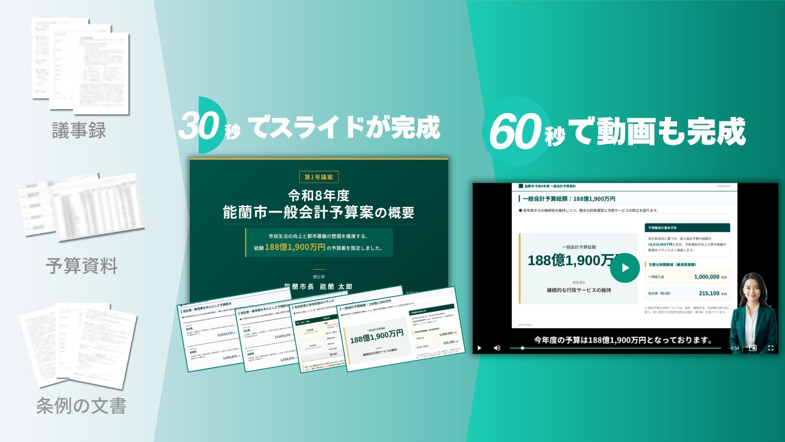 日本発、動画生成AI「NoLang(ノーラン)」を提供する株式会社Mavericks(本社:東京都文京区、代表者:Founder CEO 奥野 将太)は、スライド生成機能に自治体業務に特化した「自治体向けサンプルスライド」を新たに追加しました。本機能では、議会議事録や条例テキスト、予算案資料などのPDF・テキストを入力するだけで、図表・見出し付きのスライドを自動生成し、そのままナレーション付き動画として出力することが可能です。議会報告・条例解説・予算説明・窓口案内など自治体業務で頻出する資料作成シーンに対応したサンプルスライドをテンプレートとして選択できるため、専門的なデザインスキルがなくても高品質な説明資料・動画を迅速に制作でき、自治体職員の資料作成・動画制作にかかる負担を大幅に軽減します。