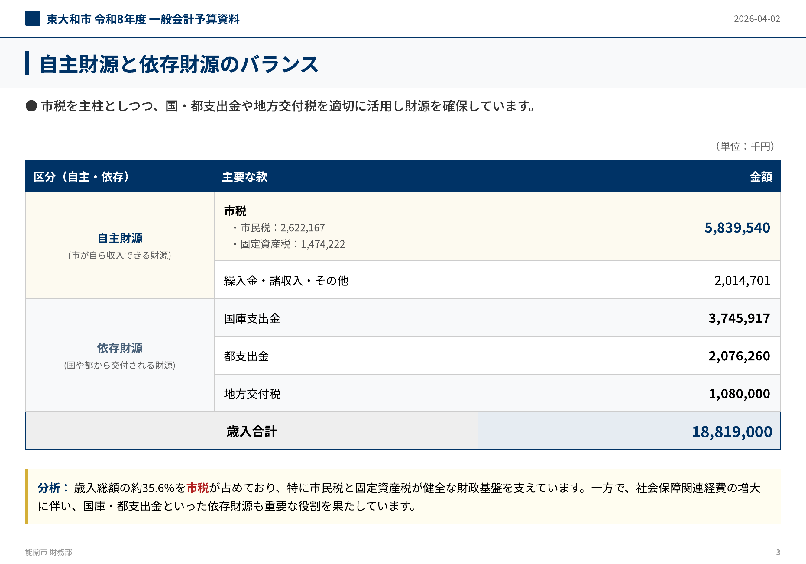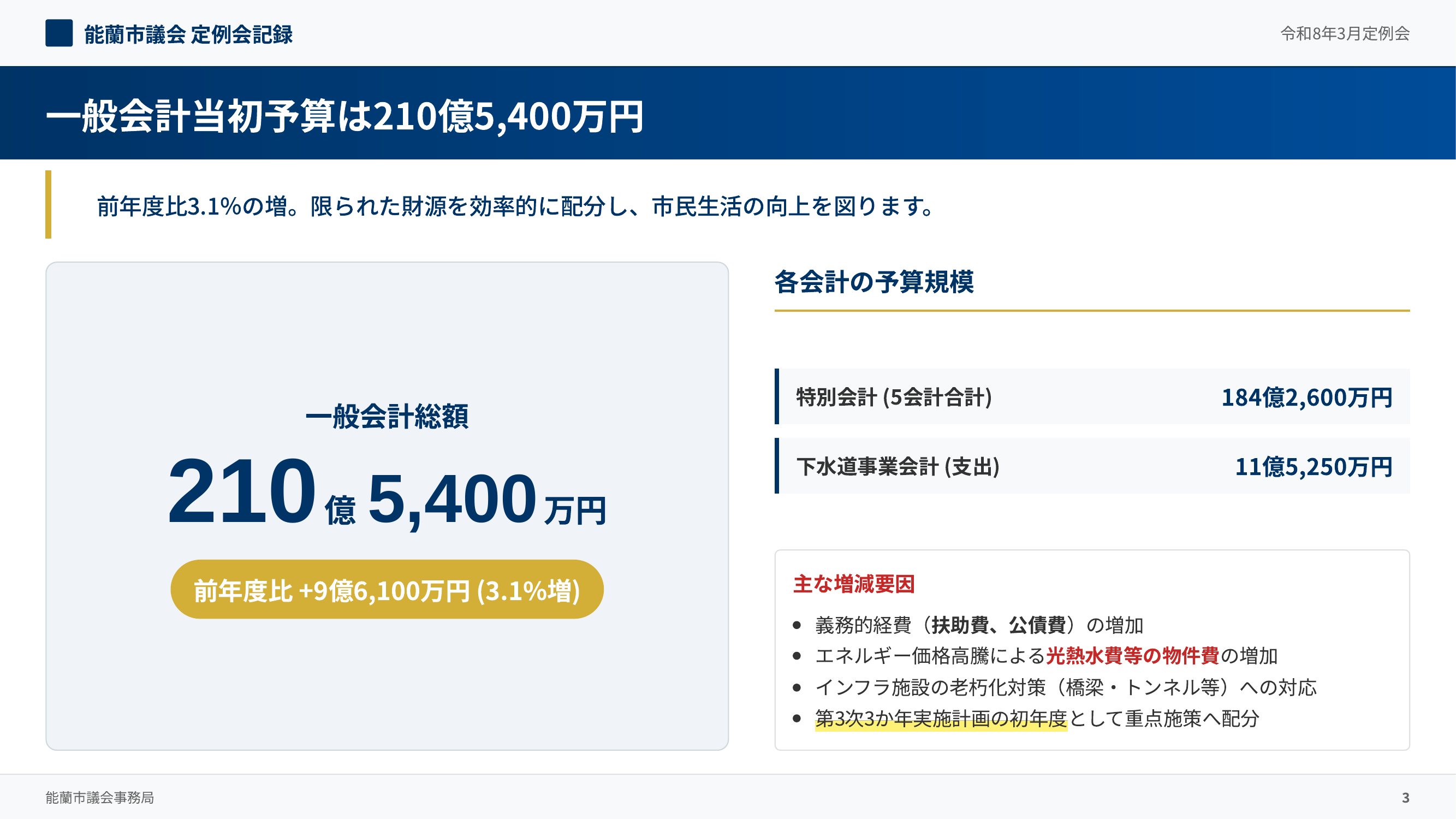 3つ目は「予算・計画の説明動画」です。予算の使途や都市計画、新施設の概要を、図表・グラフ付きでわかりやすく説明するスライドを生成し、動画化できるサンプルです。たとえば、年度予算案を住民に説明する場面や、新施設建設に関する計画を議会に報告する場面など、市民や議会向けの予算説明・計画説明にかかる資料作成時間を短縮します。数値やグラフを交えた視覚的な説明により、住民にとってわかりやすい情報提供が可能となり、行政の透明性向上にも寄与します。