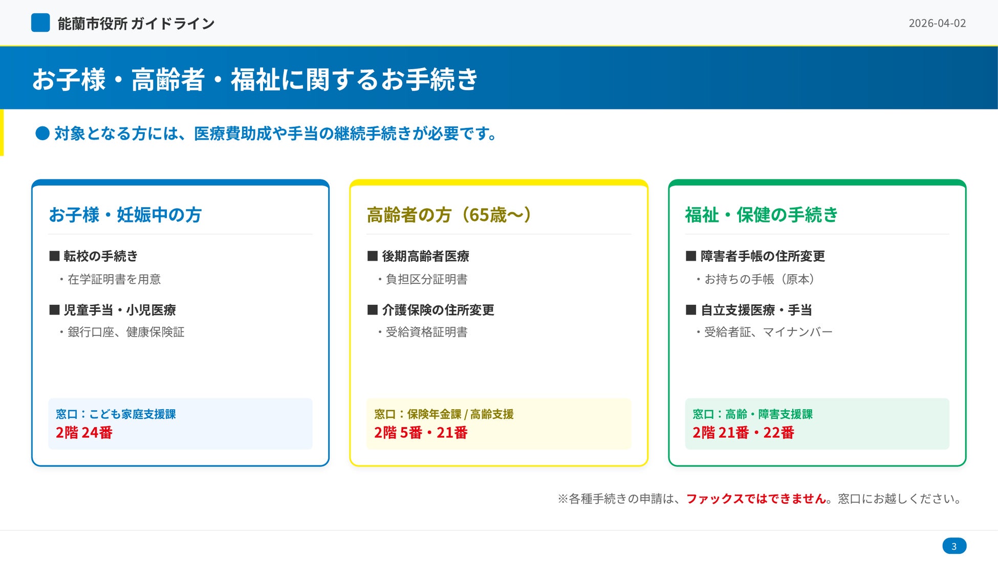 4つ目は「窓口案内・手続き説明動画(全庁展開向け)」です。各課共通デザインの窓口案内・手続き説明スライドを生成し、動画化することができます。1つのベース動画をもとに、全区役所・全出先機関の手続き内容に合わせてバリエーション展開できる設計となっており、制度改定時には全庁一括で更新することが可能です。利用頻度が高い窓口業務の説明を統一感のあるデザインで提供し、常に最新の状態に保つことができます。各拠点で個別に資料を作り直す手間がなくなるため、制度改定時の対応工数を大幅に削減でき、住民に届く情報の品質も均一化されます。