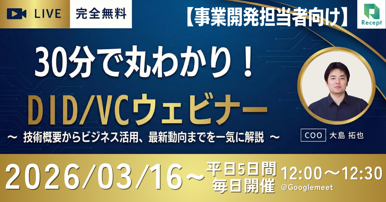 株式会社Recept(本社:東京都千代田区、代表取締役CEO:中瀬 将健)は、2026年3月3月第3週に平日5日連続にて、12:00よりオンラインウェビナー「30分で丸わかり!DID/VCウェビナー」【事業開発担当者向け】を無料開催いたします。