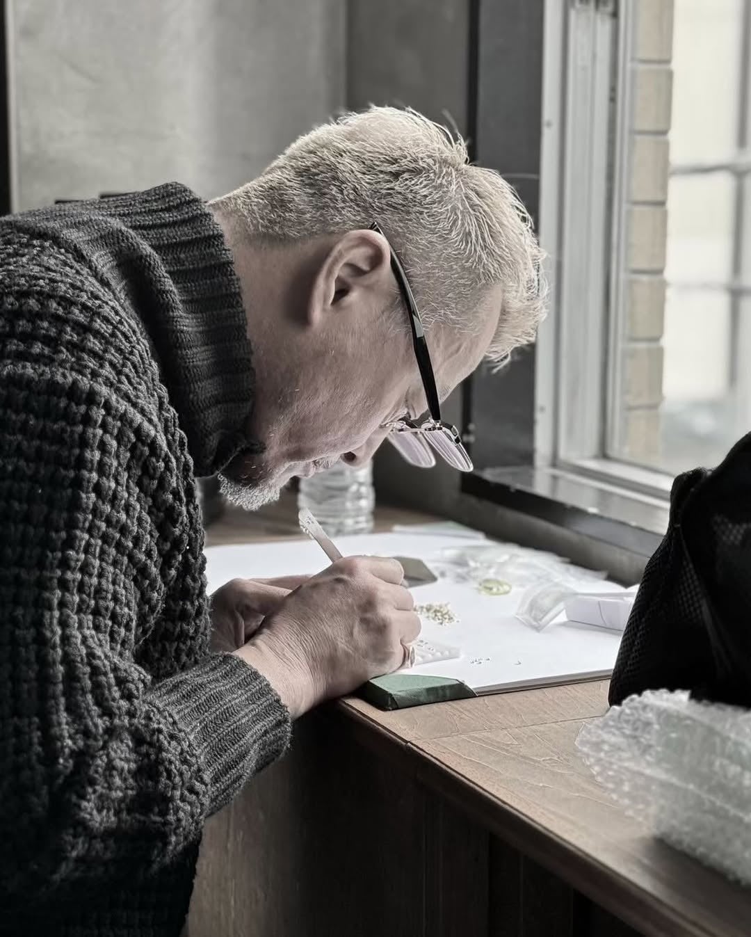 今回のコレクションでは、細身のアームとシャープに仕上げた爪がルースの美しさを最大限に引き立て、洗練されたコントラストを生み出します。特に、留め上がり後に爪の長さを0.1mm単位で削り、宝石だけが指に乗っているかのような仕上がりを実現。さらに、一部のデザインではルースをわずかに外側下に傾けることで、柔らかな佇まいを演出しました。