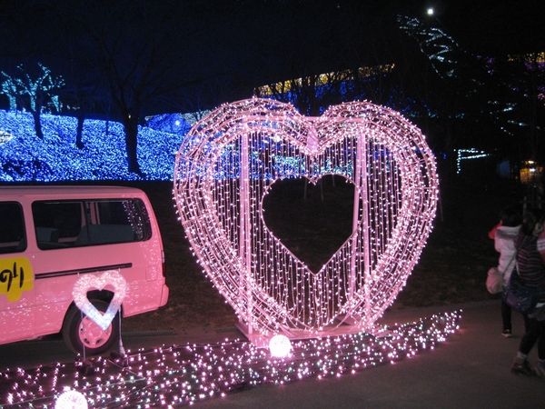 中心に、華やかなピンクやホワイトのイルミネーションや光るハートの