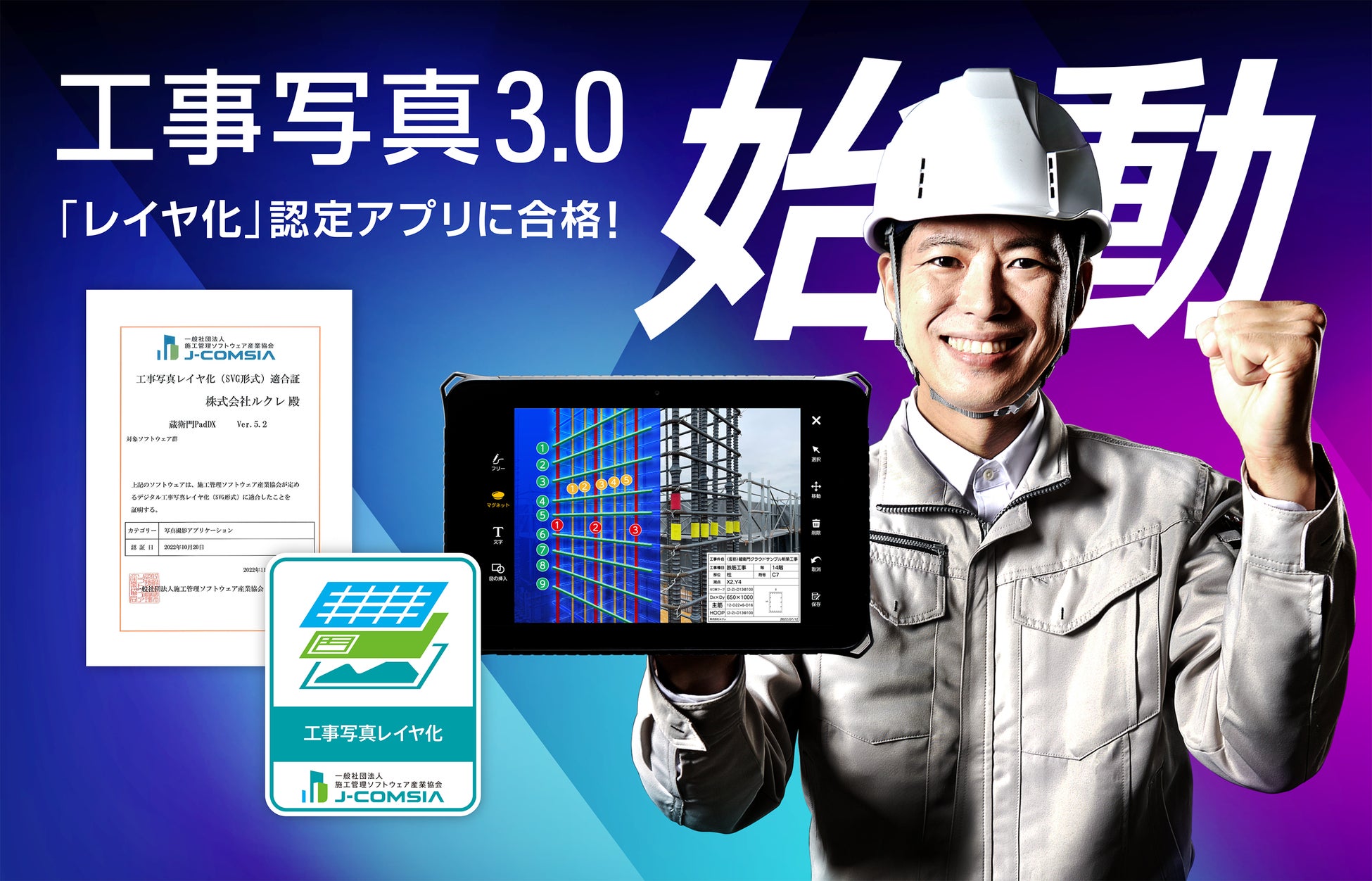 この認定は、フィルム、デジタルカメラに続く工事写真3.0の標準規格としてJ-COMSIAが推進する「レイヤ化」対応アプリとして、以下の条件をクリアした製品にのみ与えられる、いわば「お墨付き」の証です。