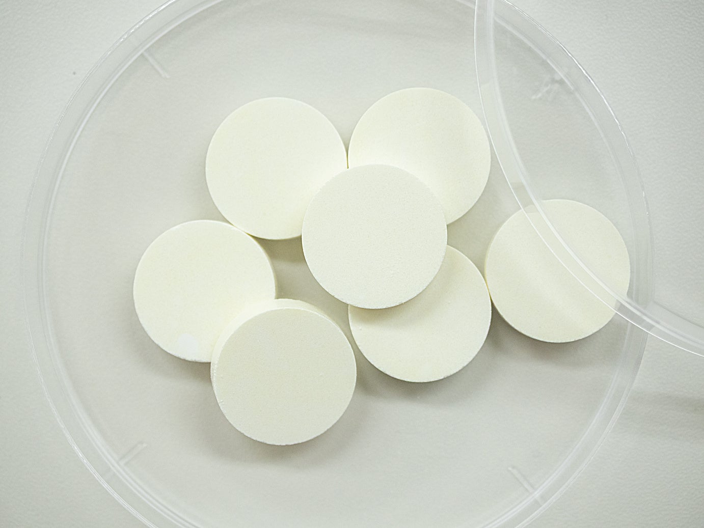 本開発では、化粧品成分を打錠技術で固形化し、安定性を高めつつ、水に触れた際に速やかに溶ける設計を採用しています。発泡錠の処方骨格を応用することで、打錠製剤の課題である“崩壊性の確保”に取り組み、安定性と使いやすさを両立させています。 打錠工程では、圧縮強度や水分含有率、粒径分布を最適化。 肌に伸ばしたときのテクスチャーや塗布感にも徹底的にこだわり、 “技術が生む心地よさ”を追求しています。現在は試作段階にあり、量産体制の構築や共同開発パートナーとの連携を検討しています。