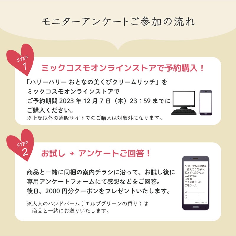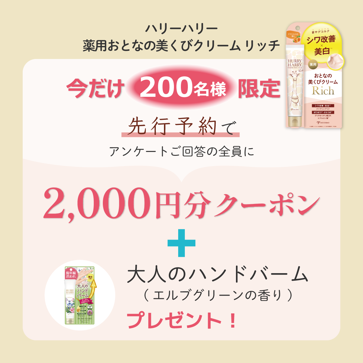 2,000円分クーポン&「ハリーハリー 大人のハンドバーム(限定エルブグリーンの香り)」現品をプレゼント!