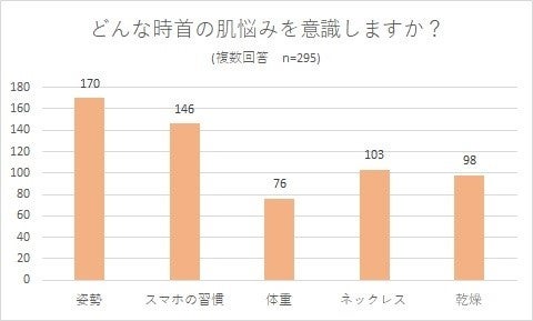あわせて姿勢(猫背)に対しての意識も高いことから、首への負担が『シワ』や『ハリ不足』の悩みに繋がる人も多いことが見受けられますね。