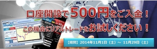 SBI FXトレードが提供する外国為替証拠金取引「SBI FXTRADE」は、2014年11月1日(土)より新規に口座開設頂いたお客様を対象に500円入金企画を実施しました。