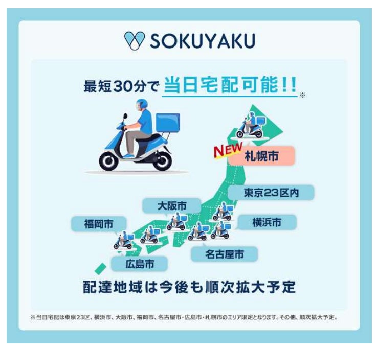 「SOKUYAKU」関東・関西・中部・中国・九州に続き処方薬の配送網を拡大 <北海道地方初>札幌市内での処方薬当日配送サービス提供開始