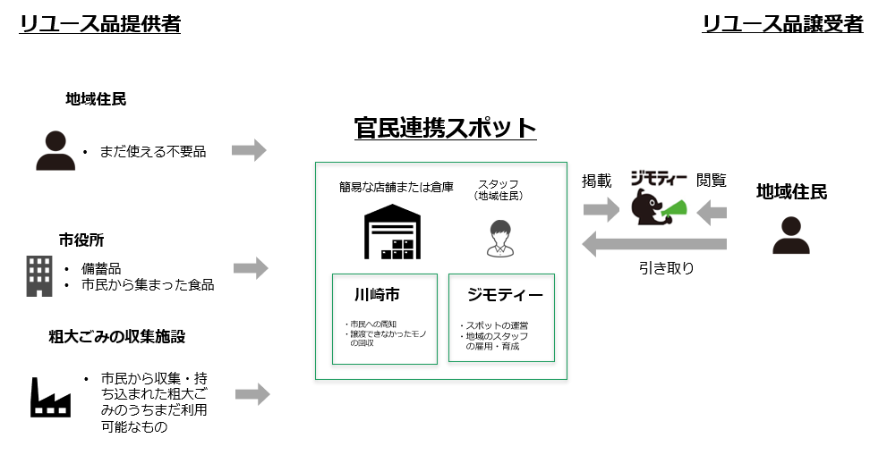 株式会社ジモティー(以下、ジモティー)は、神奈川県川崎市(以下、川崎市)とリユースに関する協定を締結し、2022年11月16日から実証実験として「ジモティースポット川崎」を開設します。ジモティーが官民連携のリユース拠点を政令指定都市で開設するのは初めての取り組みとなります。川崎市では2023年7月より粗大ごみ処理手数料の値上げを予定しており、粗大ごみのなかでまだ使えるモノのリユースを促進することで粗大ごみの廃棄量を減少させる(川崎市民の方にとっては、粗大ごみ廃棄に必要な支払手数料を少なくする)ことを目指します。なお、本事業は環境省が公募した「令和4年度使用済製品等のリユースに関する自治体モデル実証事業」(※注1) に採択されております。