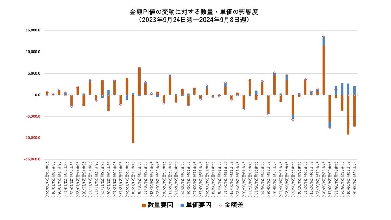 金額PI値の変動における数量および単価の影響度合いを確認してみると、主に数量の影響が大きいことが分かります。特に2024年8月4日週では数量要因(価格に変化をもたらす数量の変動要因)、単価要因(価格に変化をもたらす単価の変動要因)ともプラスになっており、ダブルで金額PI値を押し上げたようです。つまり、売上数量が増えたこと、販売単価が上がったことの両方が金額PI値を押し上げた要因とみることができます。直近の8月18日週以降では販売単価が上がっているプラス要因を、商品の品薄によって売上数量が減ったマイナス要因を打ち消している状況が発生しています。