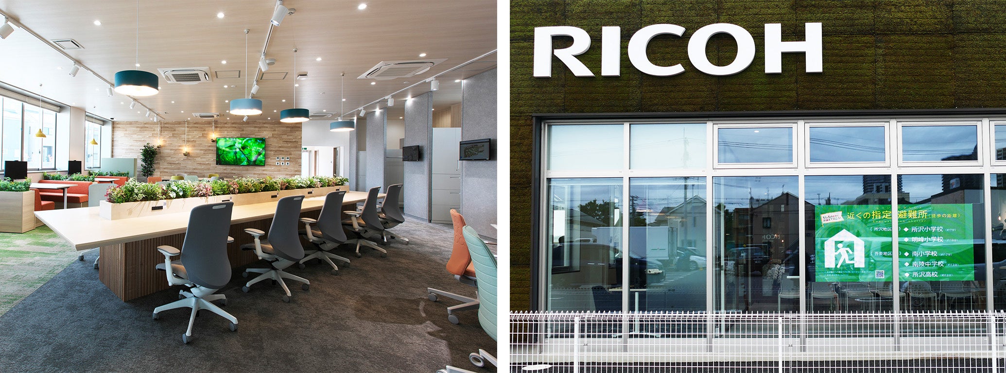 社員が事業所に行きたくなる「働きやすい」オフィスを目指し、デジタルサービスとワークスペースデザインをかけあわせたワークスペース「RICOH Smart Huddle」を実現しています。またデジタルサイネージを活用し、地域に貢献できる防災/災害情報、時事ニュース/地域ニュース、自治体からの情報を屋外に投影しています。