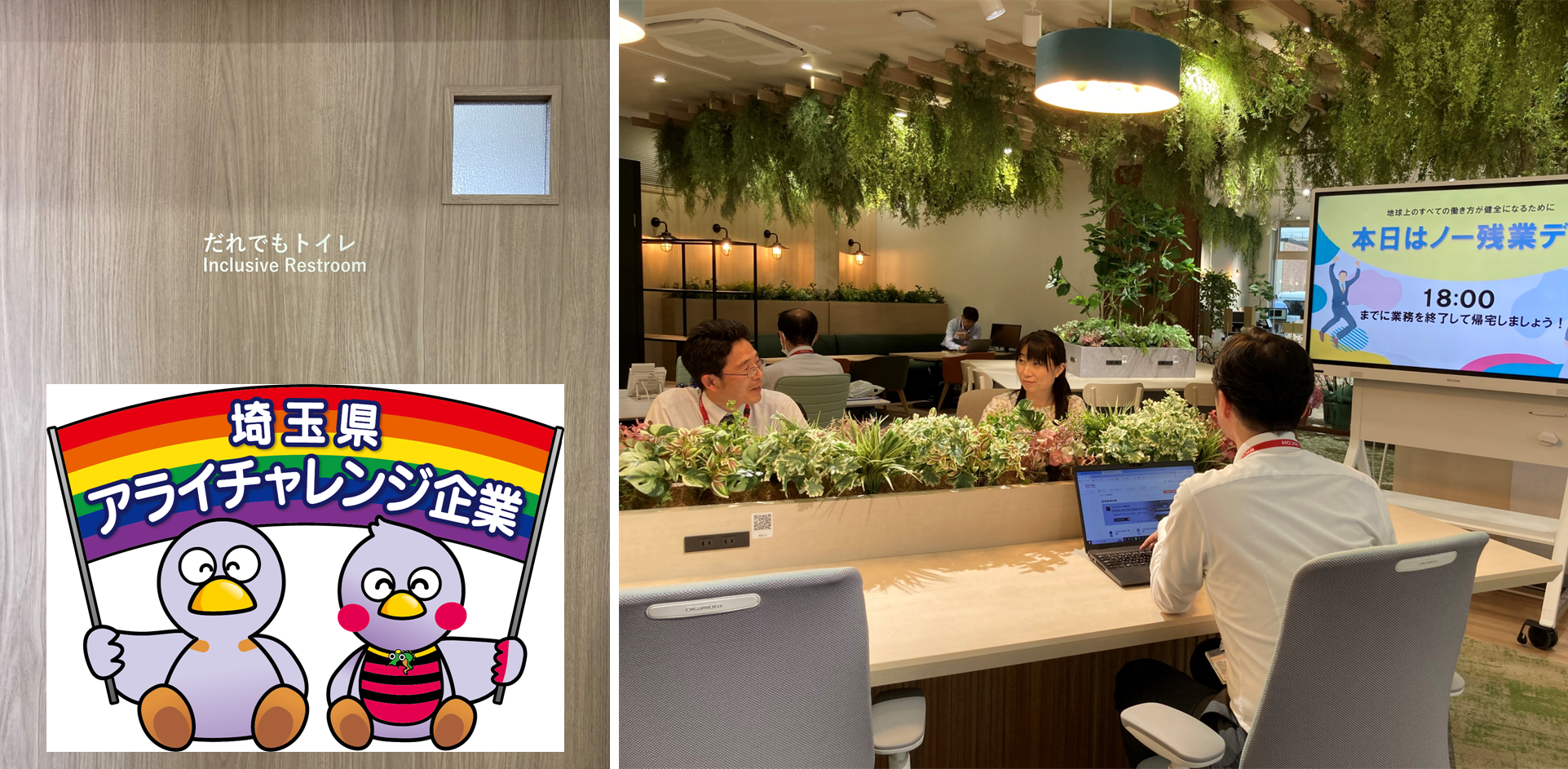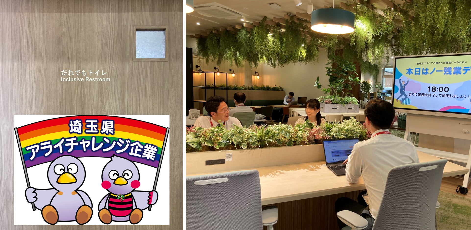 「男性」「女性」にとらわれないLGBTQフレンドリーを意識したトイレ、更衣室を設置。こうした取り組みが指標の一つとなり、「埼玉県アライチャレンジ企業」として登録されました。性の在り方に捉われない働き方を推進しています。