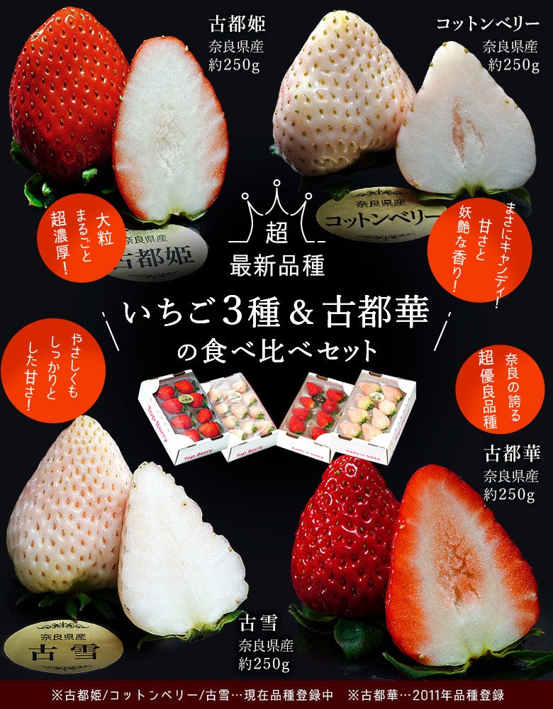 今、まさに品種登録中の最新3品種、①『コットンベリー』➁『古都姫(ことひめ)』③『古雪(こゆき)』と奈良県が誇る超優良品種 ④『古都華(ことか)』をセットにして産地直送します。