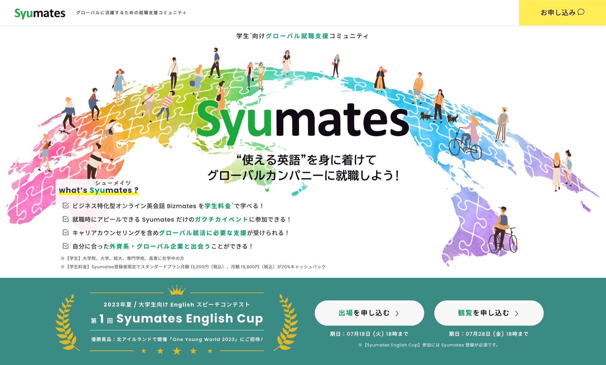 「Syumates」は学生自身が、グローバルな環境で働いている未来像が描け、且つそれを実現できる各種イベントやサポートを受けられる登録制のプログラムです。