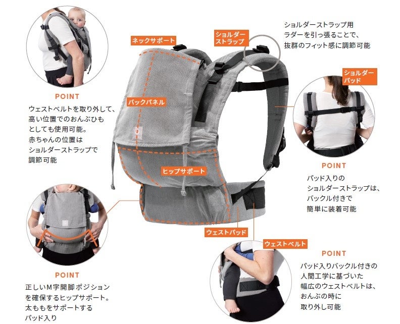 人間工学に基づき、パーツごとに調節機能を搭載。ネックサポート、バックパネル、ヒップサポートはすべて赤ちゃんの成長に合わせて調節が可能に。ウェストベルトは保育者の体型に合わせて調整できます。