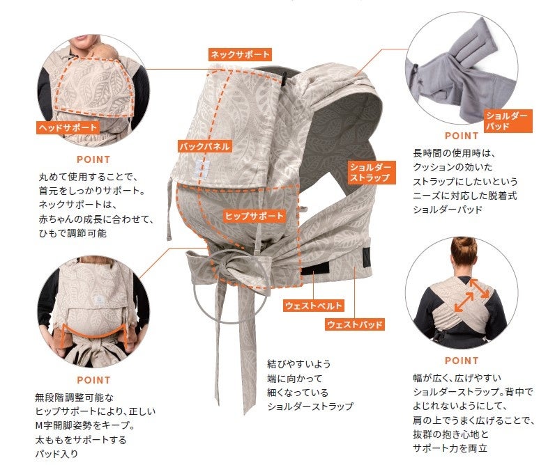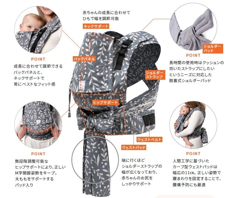 ラップ型抱っこひもの良さがふんだんに生かされる仕様で、生まれたての赤ちゃんの発達に合わせて調節することで、安全・快適な抱っこが可能に。バックル式のウェストベルトをつけ、ショルダーストラップを背中で交差させてから前で結び、赤ちゃんのお尻を支えます。対面抱っこ、おんぶに対応。