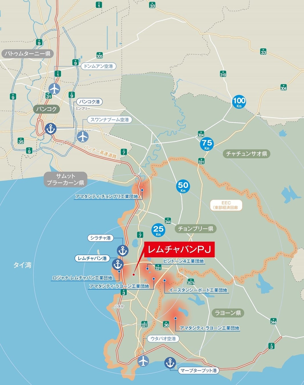 本物件は、タイ最大の湾岸工業地帯(EEC)を構成するチョンブリ県における物流施設開発案件です。東南アジアでも有数の大型港であるレムチャバン港に近接し、製造業をはじめ幅広い産業における保管や積み替えニーズを背景とした、倉庫需要の旺盛なエリアとなります。施設計画については、平屋建て倉庫6棟から成るマルチ型物流施設となります。