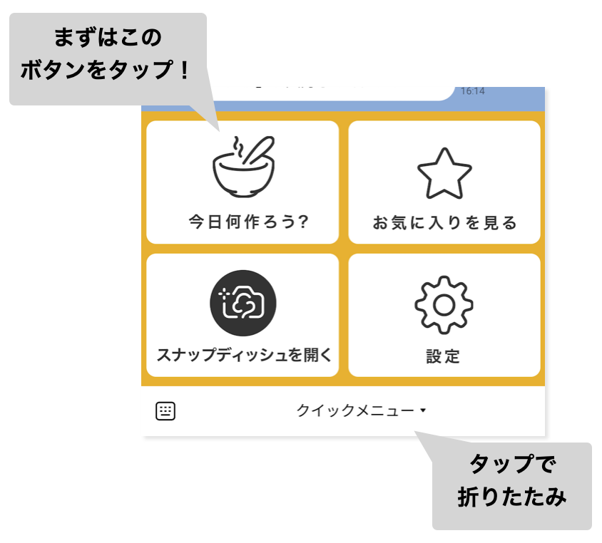 ユーザーがLINEで「スナップディッシュ AI料理チャット」を友だち登録し、クイックメニューの「今⽇なに作ろう? 」をタップすると、玉ねぎ型AI料理アシスタント・オニョーンがユーザーに対して、その時の「トレンド」を提案します。他にも、オニョーンは料理に使われることの多い「旬の⾷材」や「人気の検索ワード」、あっさり、ガッツリ、和食、洋食、中華などの「カテゴリ一覧」などを提案します。ユーザーはその時の気分によってタップしていくだけで、2,900万超の「スナップディッシュ」料理投稿の中からオニョーンが提案する最適な料理投稿と出会うことができ、気に⼊った料理は「お気に⼊り」に追加することもできます。さらに、オニョーンはユーザーに対して、似ている料理を提案したり、レシピを教えてくれます。加えて、レシピ情報がない場合でも、オニョーンが料理投稿情報を元にレシピを作成してくれます。
