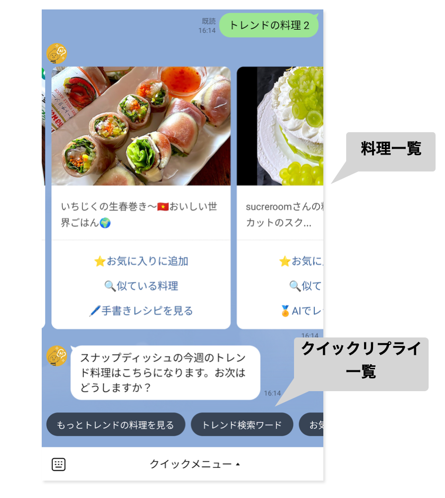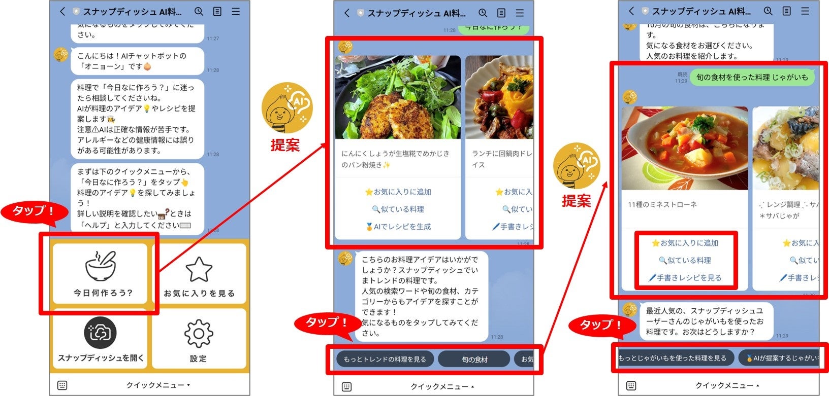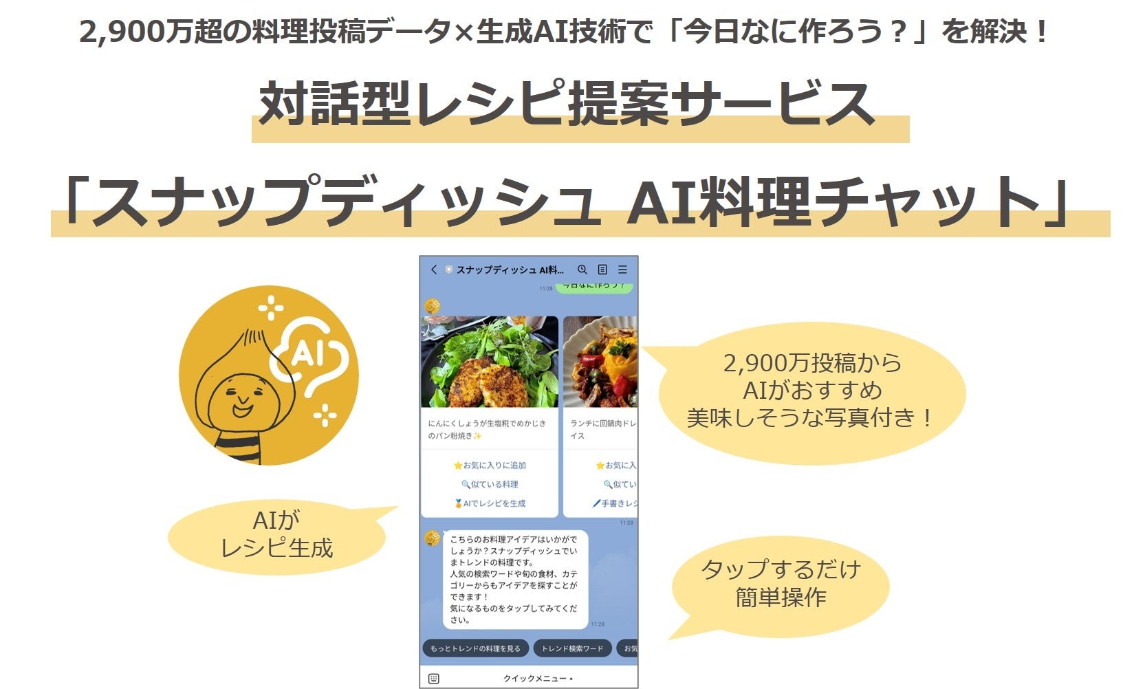 本サービスは、家庭で料理をする方の「今日なに作ろう?」の悩みを、AI技術と当社が運営する国内最大級の料理SNS「スナップディッシュ」の2,900万超の料理投稿データを活用し解決します。LINEのトーク画面で「トレンド」「旬の食材」などから気になる項目をタップするだけで、スナップディッシュ料理投稿の中からおすすめの料理や似ている料理を提案します。レシピ情報がない場合は、ChatGPTも搭載する玉ねぎ型AI料理アシスタント「オニョーン」が料理タイトルをもとにレシピ情報を生成し、調理体験をアシストします。