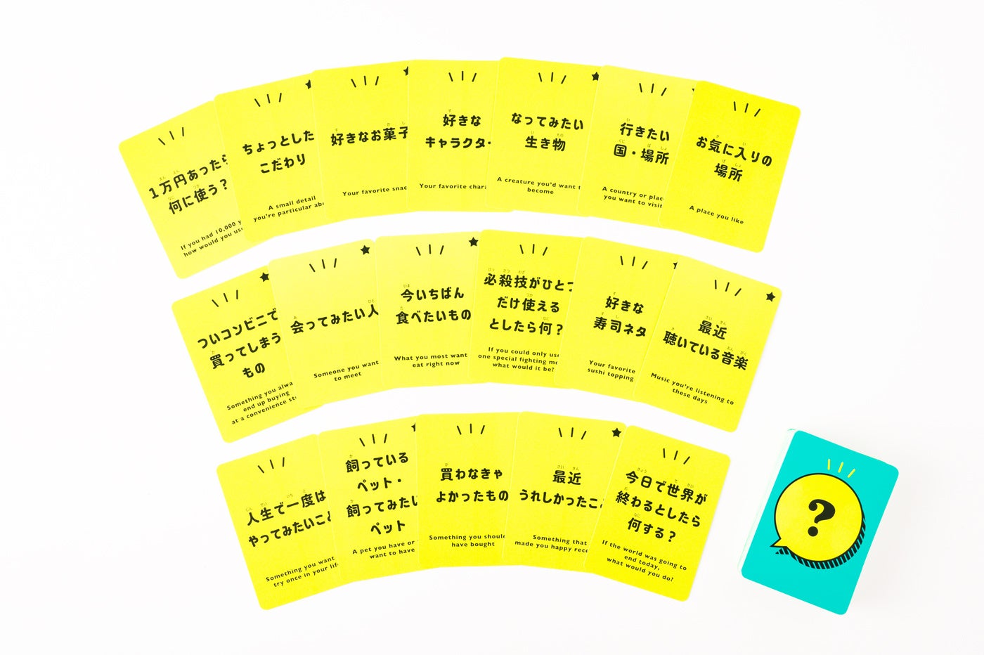 思いがけない共通点や発見があるので、初めて会う人とは会話を広げるきっかけに、仲がいい友達や家族とは新たな一面を知るきっかけになり、子どもから大人までちょっとした集いの場でのレクリエーションやアイスブレイクにぴったりのゲームです。