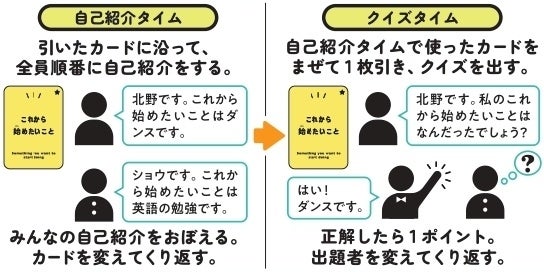 出たお題カードに沿ってみんなで順番にたくさんの自己紹介をする【自己紹介タイム】、自己紹介で話した内容をクイズで出題して当て合う【クイズタイム】の順番で進行し、クイズに多く正解した人が勝ちとなります。