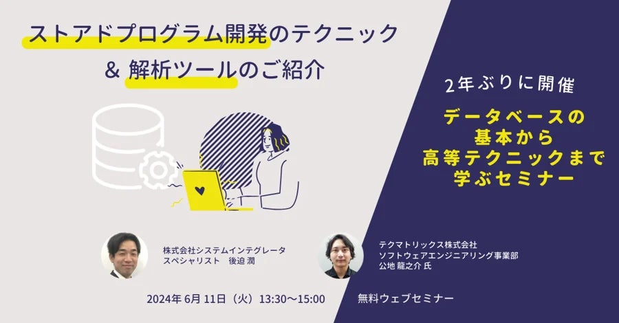 株式会社システムインテグレータ(本社:さいたま市中央区、代表取締役社長:引屋敷 智、東証スタンダード:証券コード3826)は、テクマトリックス株式会社(本社:東京都港区、代表取締役社長:矢井 隆晴、東証プライム:証券コード3762)と共催で、「データベースの基本から高等テクニックまで学ぶセミナー~ストアドプログラム開発のテクニック&解析ツールのご紹介~」と題した無料ウェビナーを、2024年6月11日(火)に開催することをお知らせします。