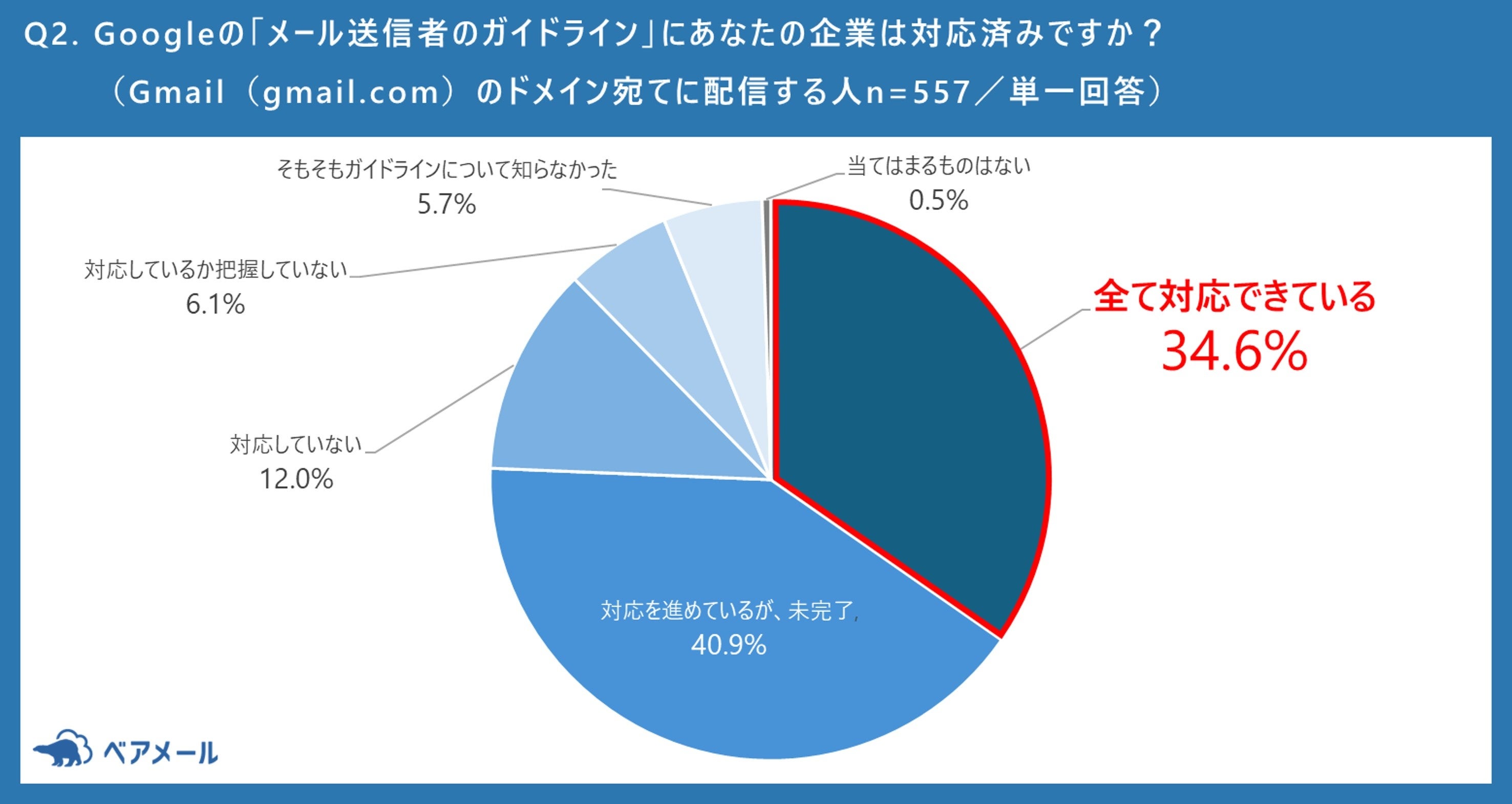 【Gmailガイドライン変更に伴う、メール送信者を対象とした意識調査】ガイドラインに全て対応できているのはわずか34.6% 〜約6割の企業において、2月以降メールの不達や遅延が増加している可能性〜